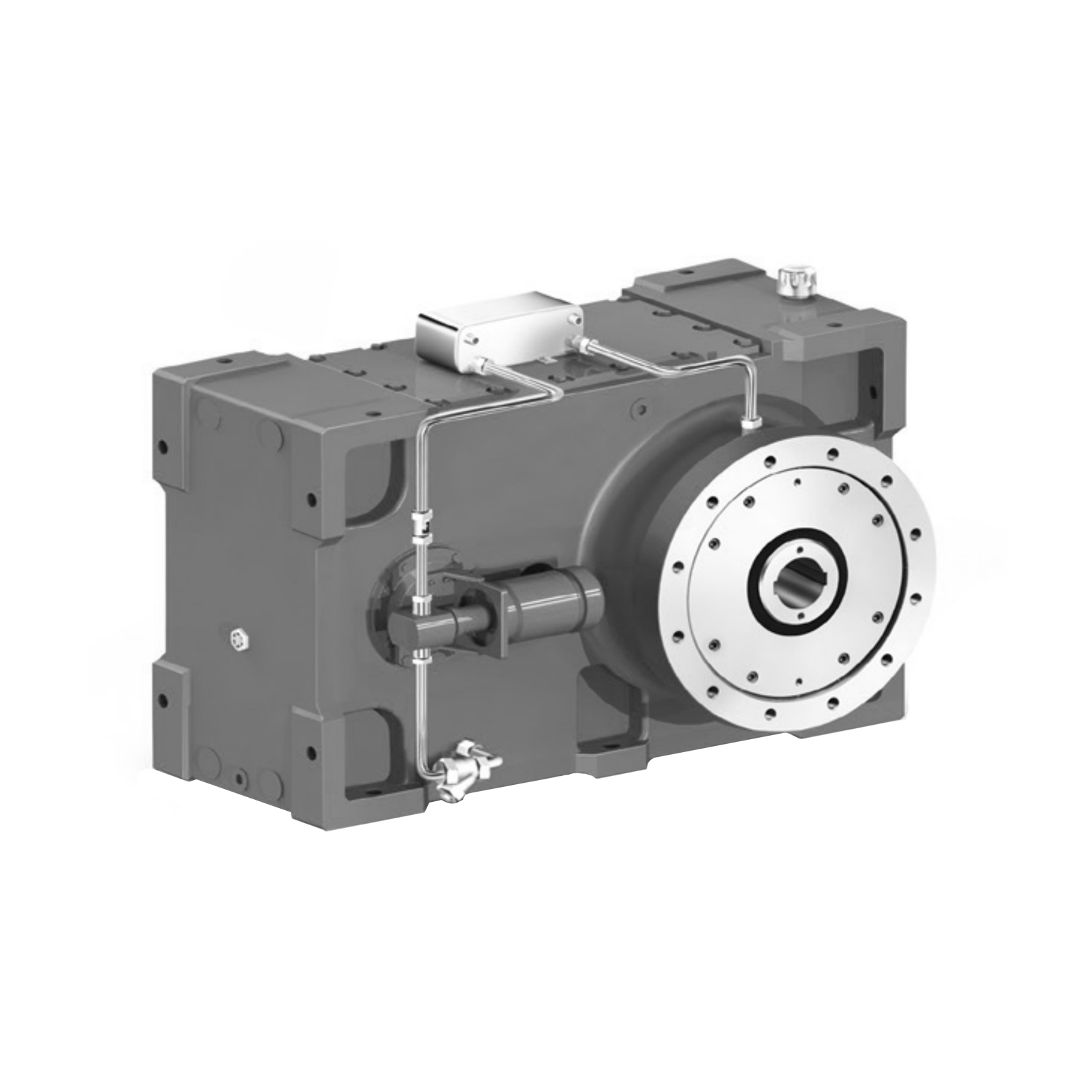 DLZLYJ 系列齿轮箱是为塑料、橡胶螺杆挤出机配套设计的高精度硬齿面带推力包的齿轮传动装置。产品设计参照JB/T8853《圆柱齿轮齿轮箱》规定的各项技术规范。其特性是齿轮和轴类零件采用了高强度合金钢材质。齿轮经渗碳、淬火、喷丸磨齿工艺加工。齿轮的精度等级为 GB/T10095 6级。齿面硬度 HRC57~62。在空心输出轴前端配置有大规格推力轴承,承受螺杆工作时的轴向推力。整机具有体积小、承载能力高、传动平稳、噪声低、效率高等特点。