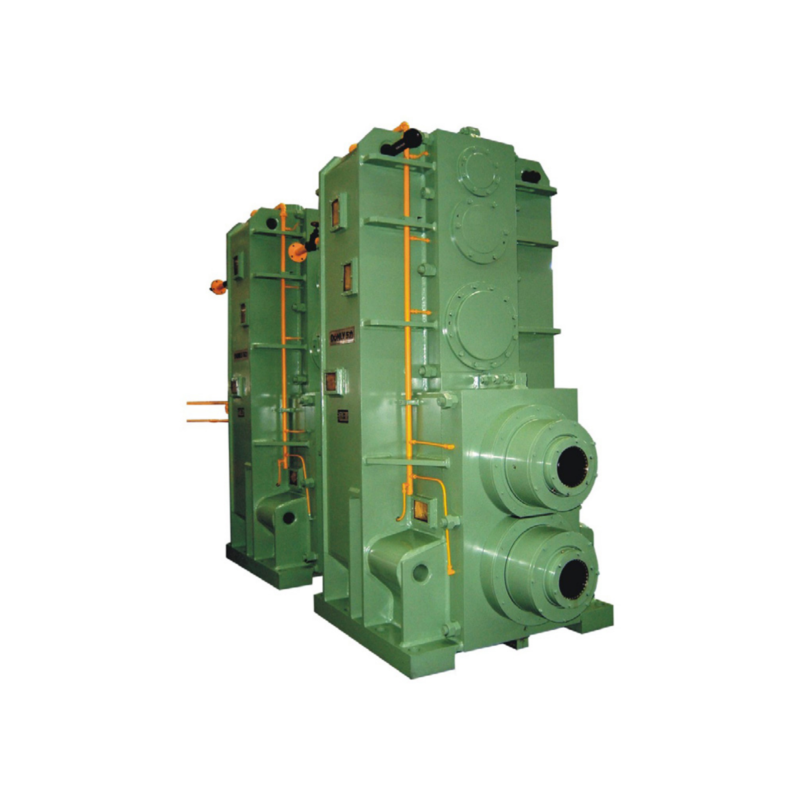 两输出轴通过万向联轴器与轧机轧辊联接,驱动轧机的轧工作。